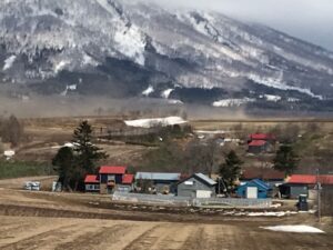 昨日の真狩村です。強風で畑の土が舞い上がってました。後ろの雪が残っているのは羊蹄山になります。