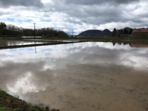 天気が悪く薄暗いですが財田地区の水田です。まだ代搔き前の状態です。