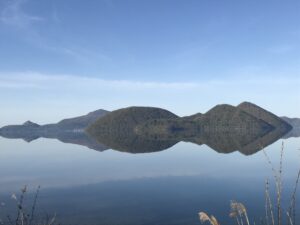 先週末の洞爺湖です。風がなく波が立っていないので綺麗に湖面に写っていますね。