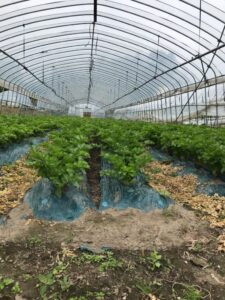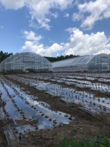 奥のハウスでは有機栽培のミニトマトが育てられています。収穫が始まったらピュアフーズとうやのECサイトでも販売させてもらう予定です。