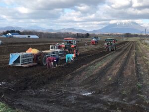 少し見ずらいですが、先頭のトラクターで長芋を掘り出し、後ろから手作業で土を落としてカゴに入れていきます。同じ芋でもじゃがいもは全て機械で収穫しているので、比べてしまうと大変な作業です。