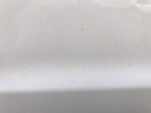 見づらいですが点々がいっぱい!全部鉄粉です。白い車なのでよく見えます。
